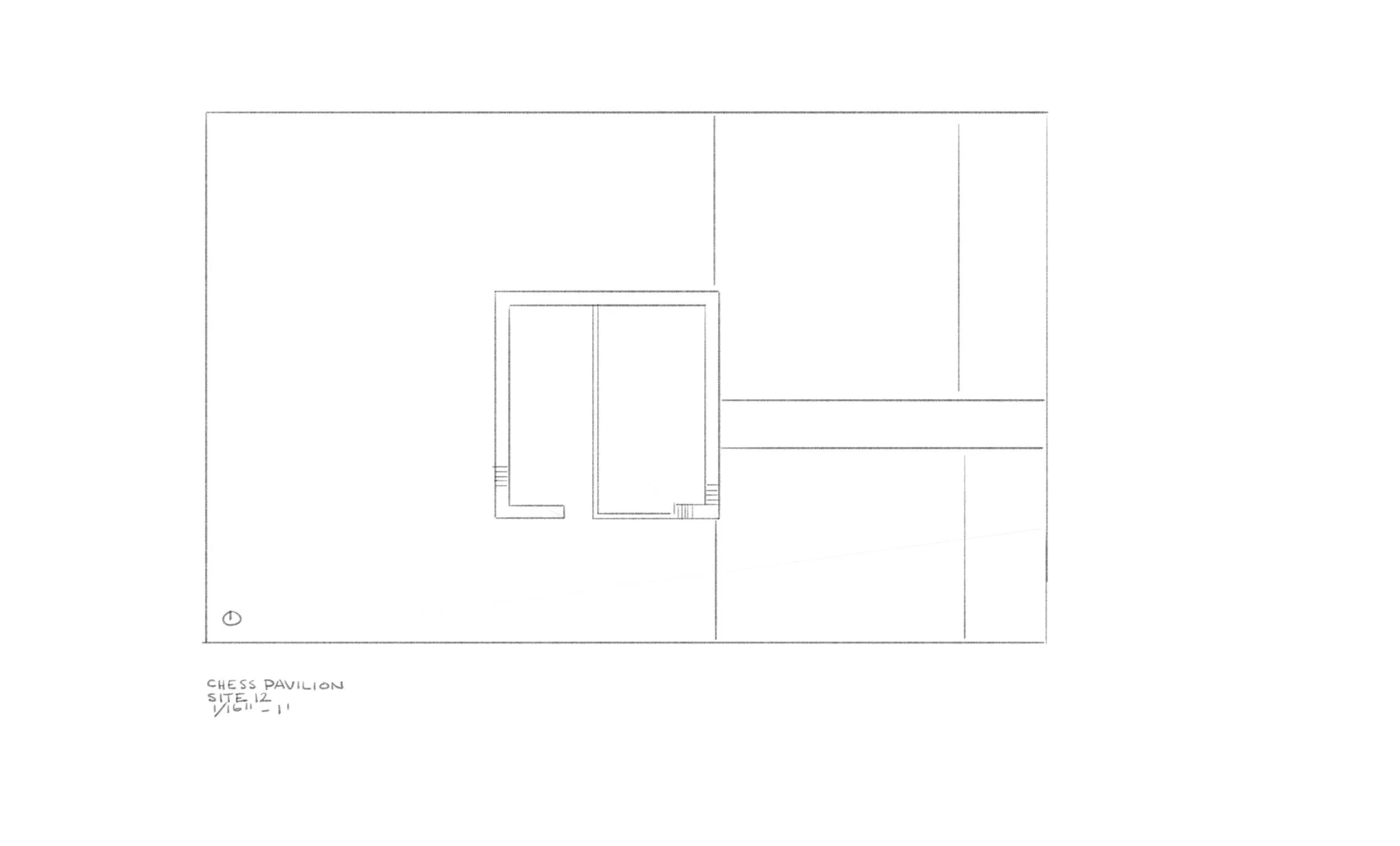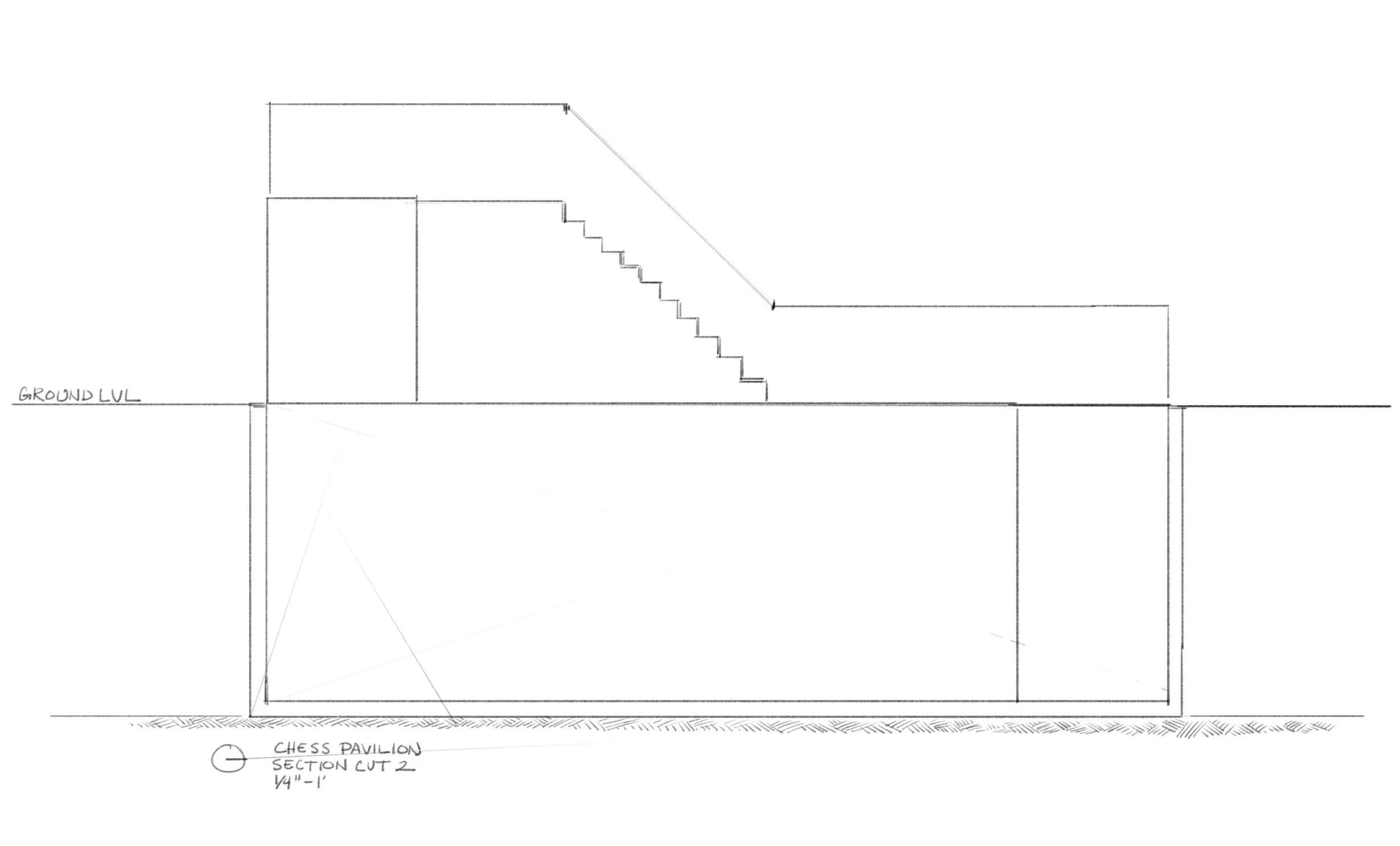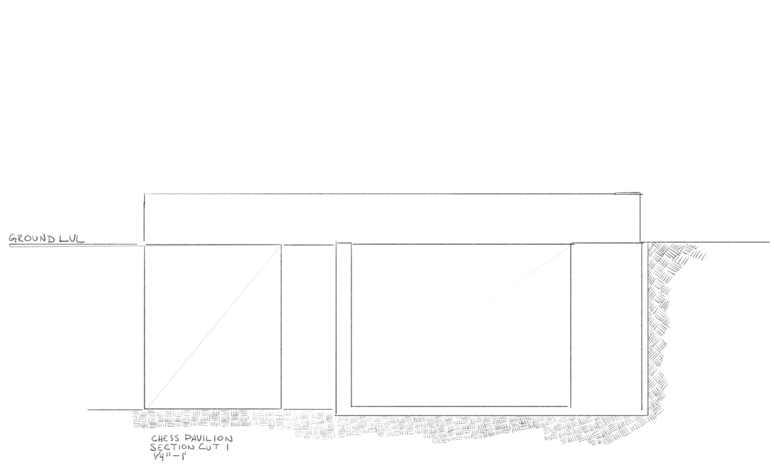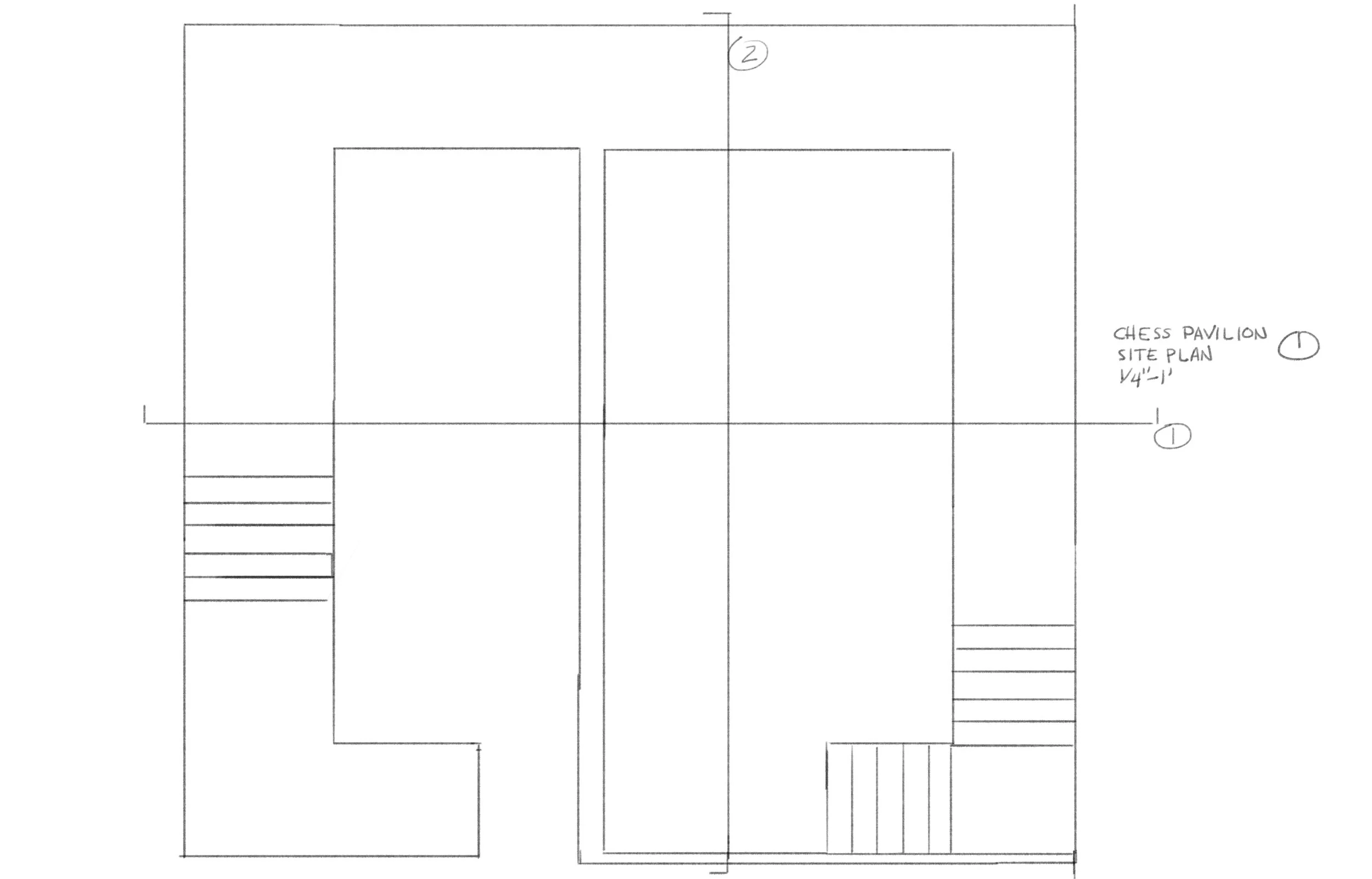 Knight to e4 is a chess pavilion located at the Sutro Baths, located at Land’s End, San Francisco, a modern day ruin. Poised between two hillside cliffs, the building burned down in the 1960s [1966, specifically] and is now a tourist attraction. The assignment called for integration of project and site. The chess pavilion sits at the far edge of the land and is situated within the ocean. The portion of the pavilion where the playing area is located pushes down into the water. It pulls up to allow for views of the Sutro Baths, the playing area, and the ocean.