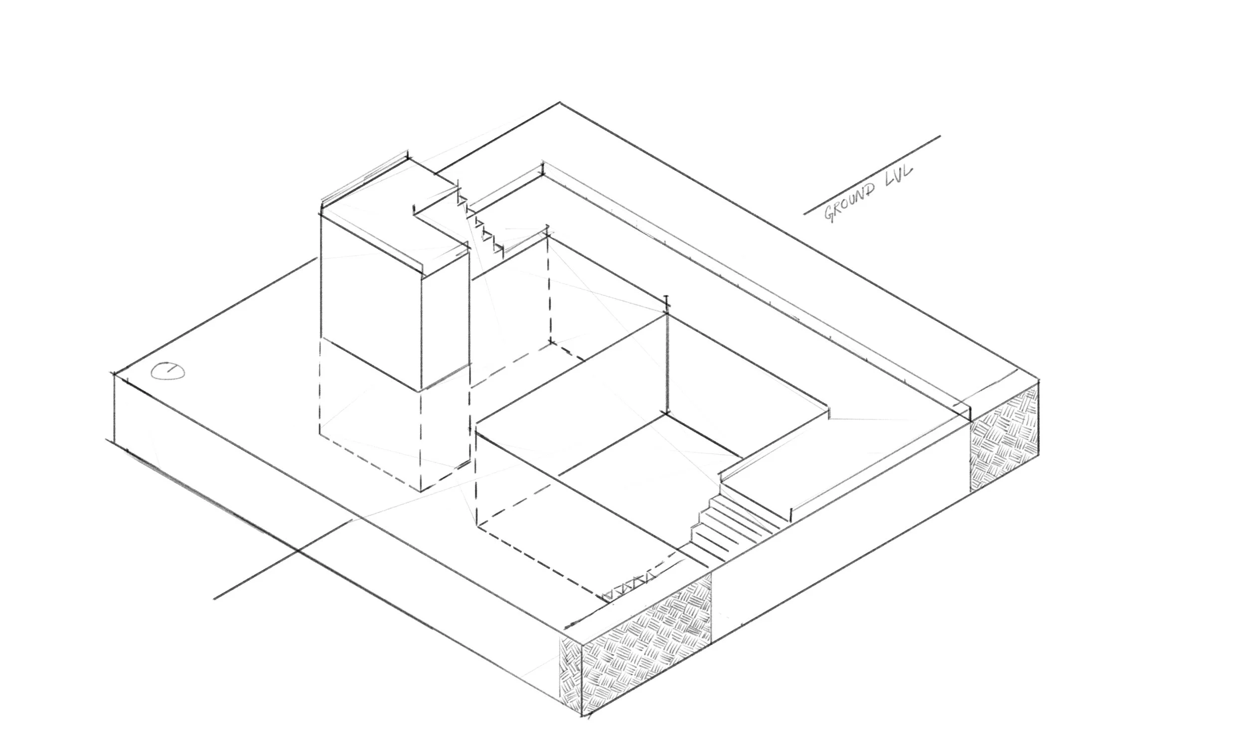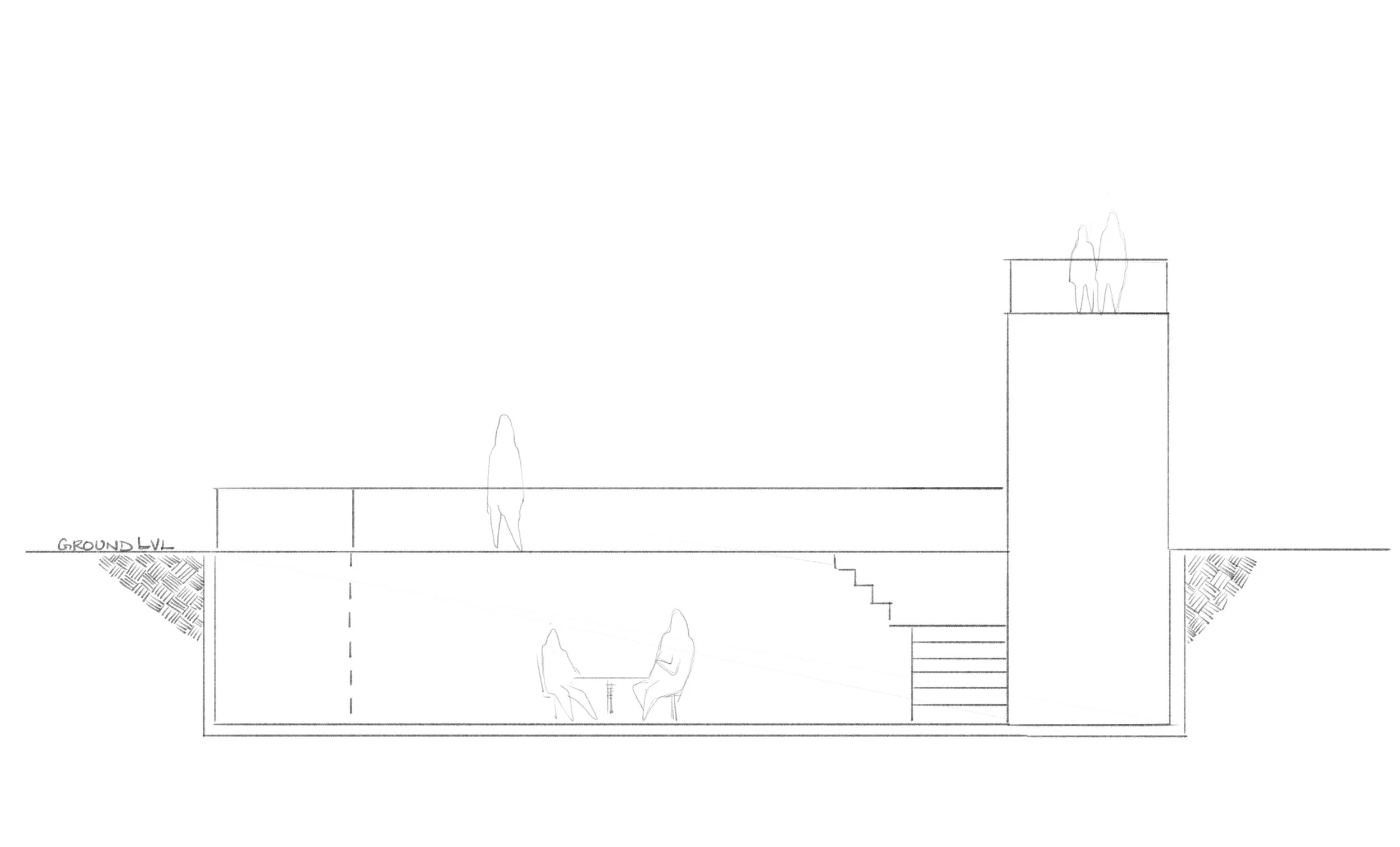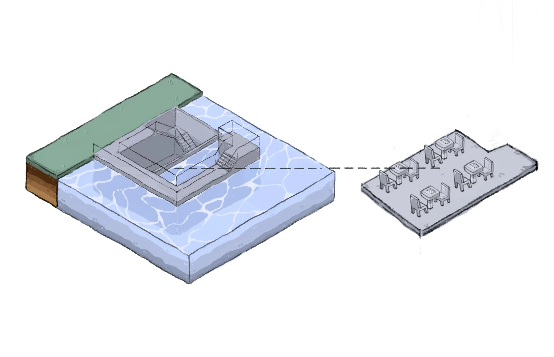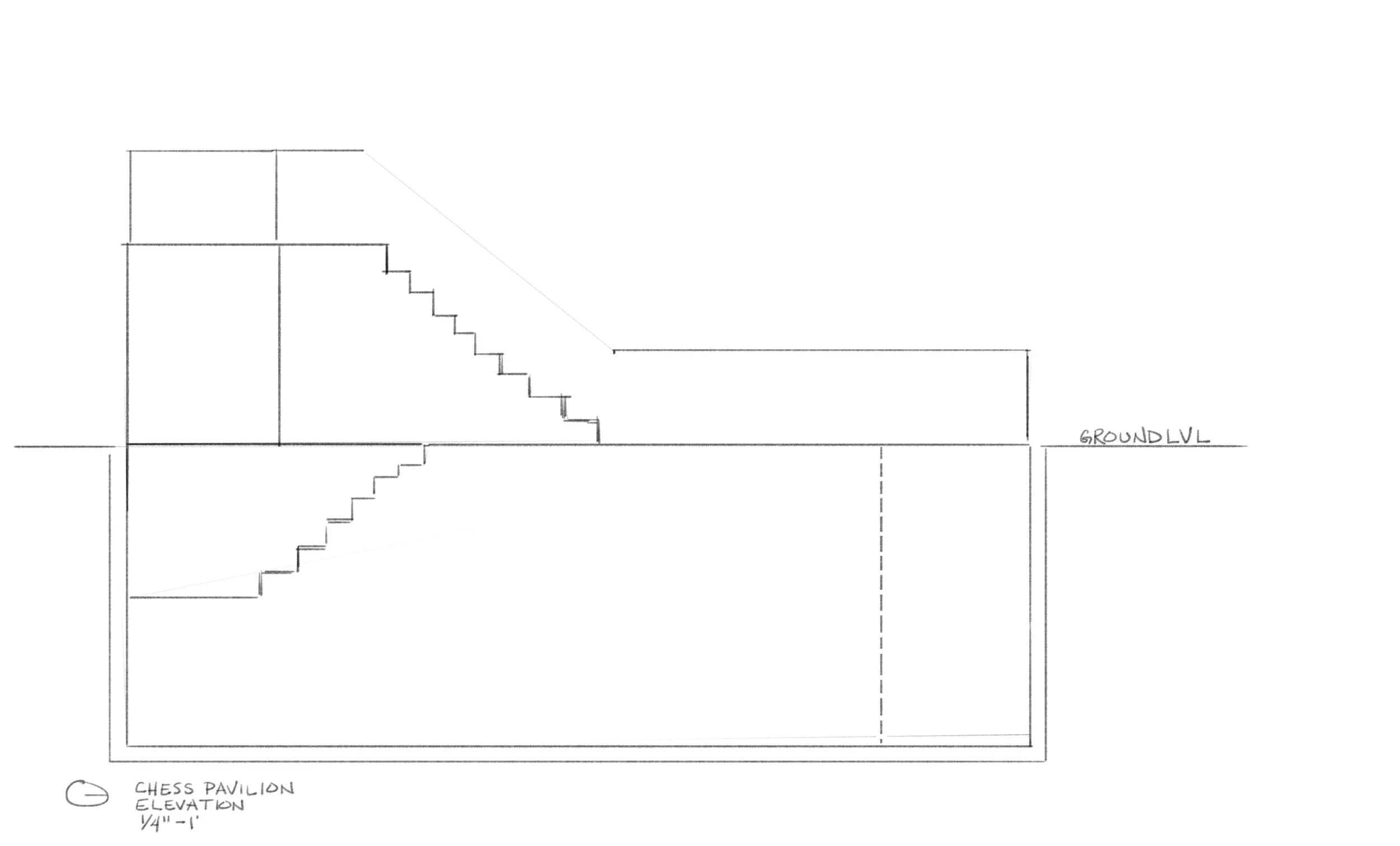 Knight to e4 is a chess pavilion located at the Sutro Baths, located at Land’s End, San Francisco, a modern day ruin. Poised between two hillside cliffs, the building burned down in the 1960s [1966, specifically] and is now a tourist attraction. The assignment called for integration of project and site. The chess pavilion sits at the far edge of the land and is situated within the ocean. The portion of the pavilion where the playing area is located pushes down into the water. It pulls up to allow for views of the Sutro Baths, the playing area, and the ocean.