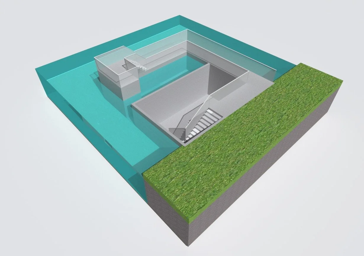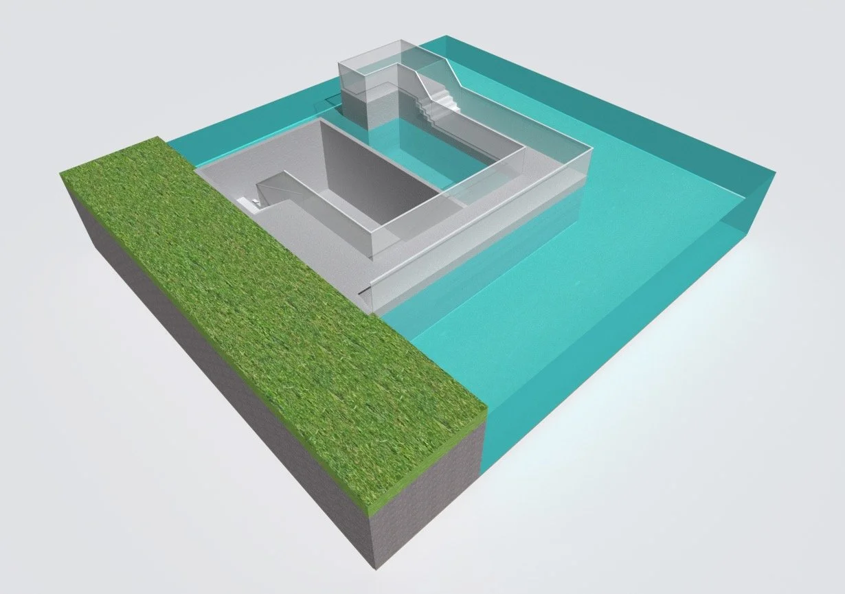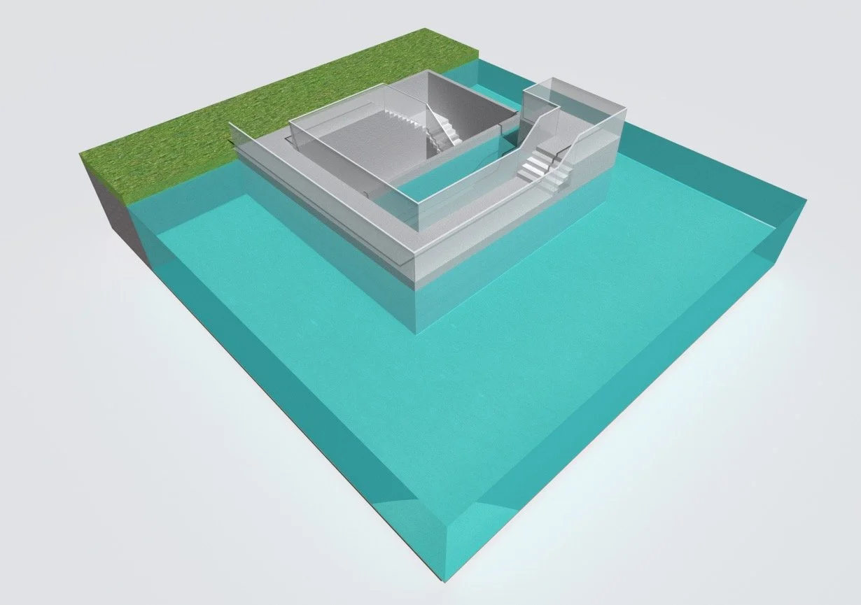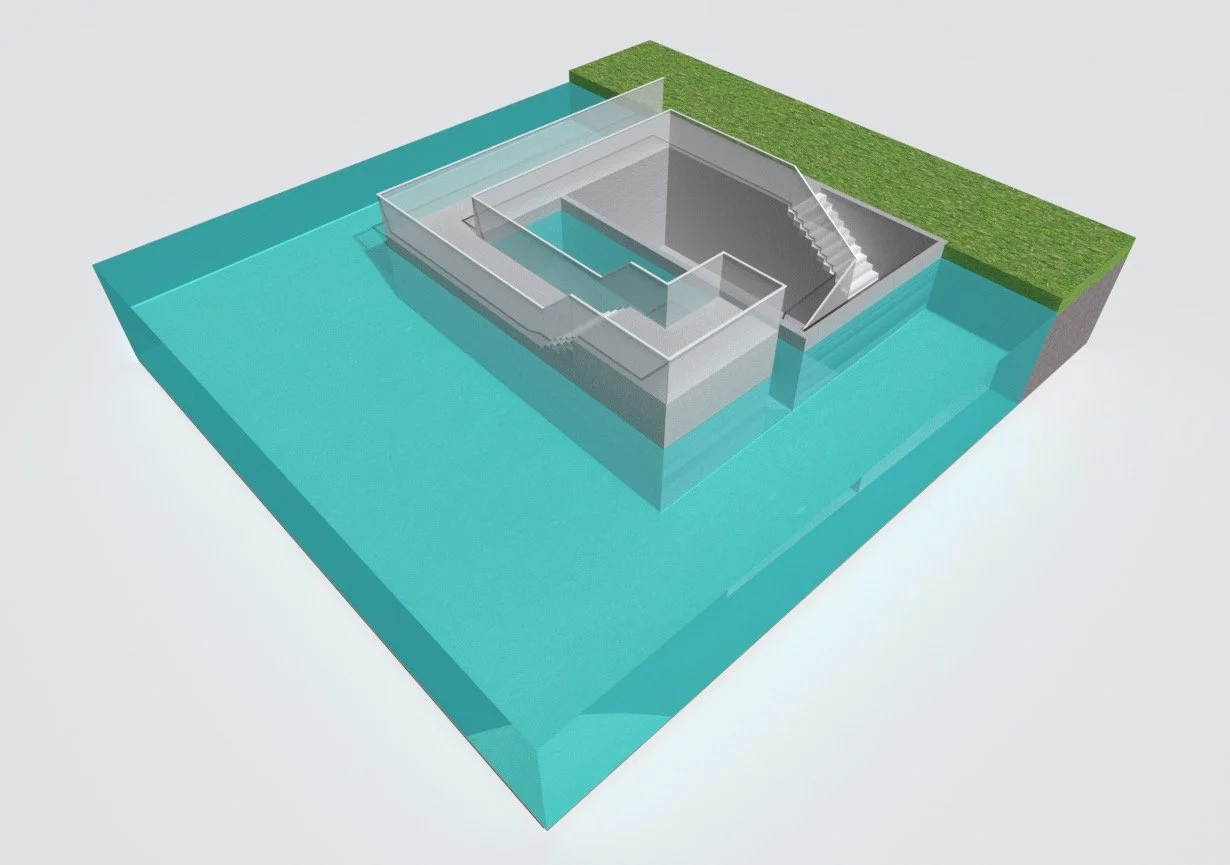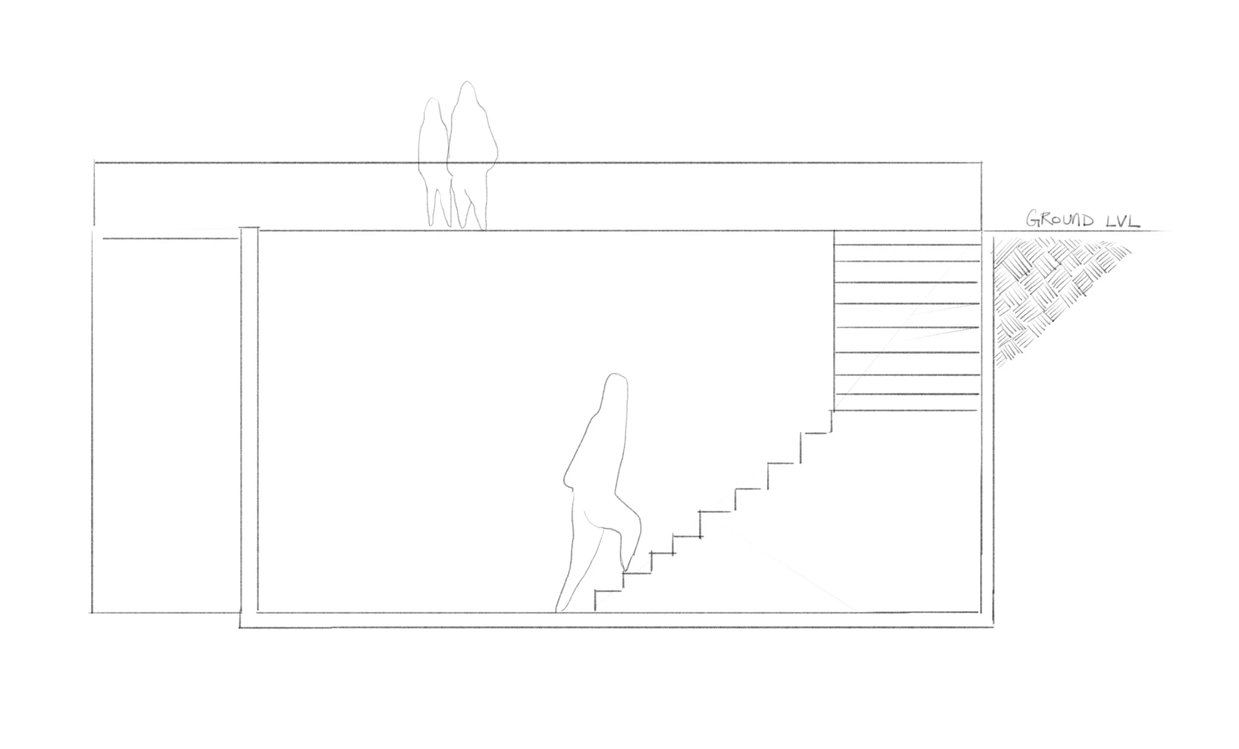 Knight to e4 is a chess pavilion located at the Sutro Baths, located at Land’s End, San Francisco, a modern day ruin. Poised between two hillside cliffs, the building burned down in the 1960s [1966, specifically] and is now a tourist attraction. The assignment called for integration of project and site. The chess pavilion sits at the far edge of the land and is situated within the ocean. The portion of the pavilion where the playing area is located pushes down into the water. It pulls up to allow for views of the Sutro Baths, the playing area, and the ocean.